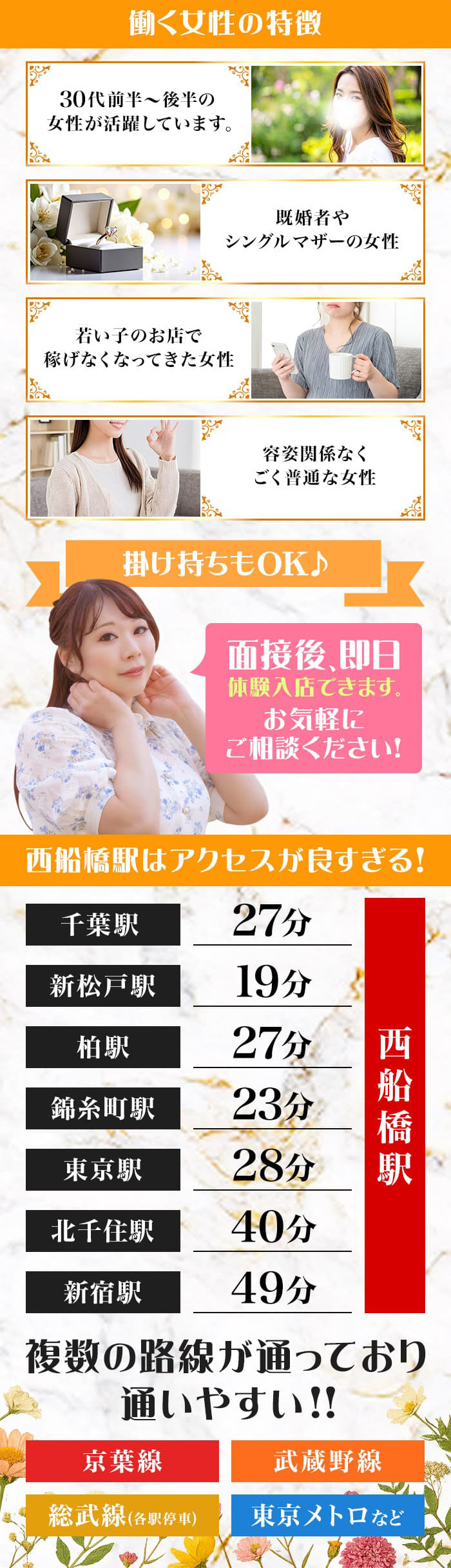 スタッフの対応力、綺麗な個室待機、西船橋駅から徒歩1分のアクセスなど、本当に素敵なお店なのできっと気に入って頂けると思います(*´ω`*)