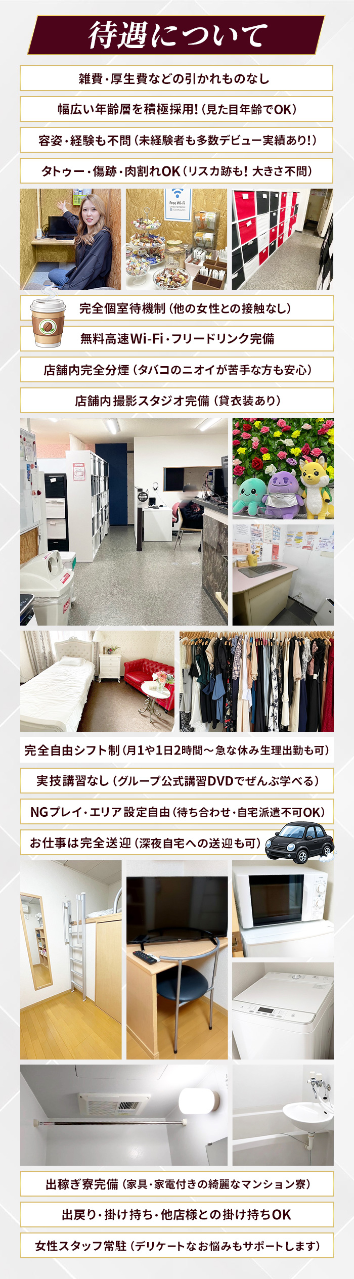 ■面接交通費全額支給 ■雑費0円 ■体験入店・即金お渡し歓迎 ■未経験者歓迎 ■実技講習なし(グループ公式講習DVDあり) ■アリバイ対策万全 ■女性スタッフ勤務 ■ワンルーム寮完備 ■保証制度あり ■傷跡・妊娠線・タトゥーOK ■完全個室待機室 ■他店かけもち歓迎 ■外待機・自宅待機OK ■終電後送迎あり ■撮影無料(衣装あり) ■ドライヤー・ヘアアイロン等貸出 ■個人ロッカーあり ■無料駐車場完備 |