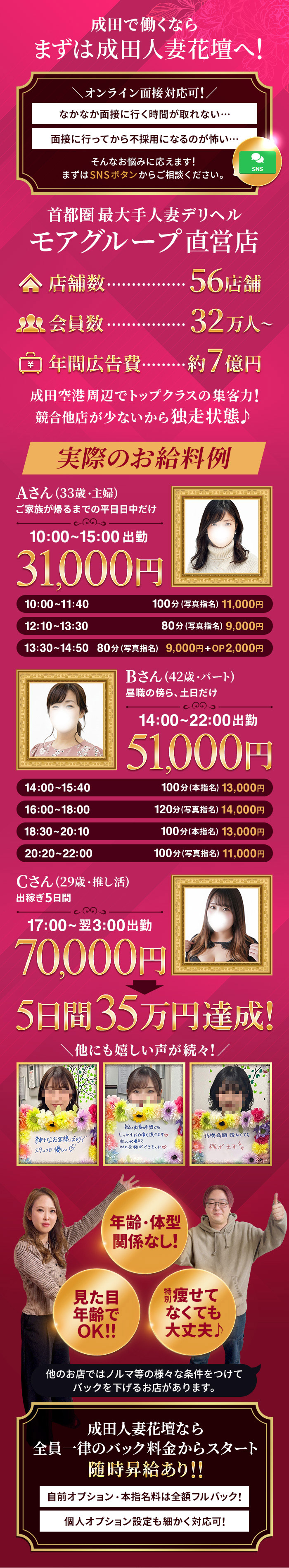 | 応募資格 | 18歳以上(高校生不可)未経験の方・経験ある方ともに大歓迎♪ 本当の人妻さんである必要はありません♪ |