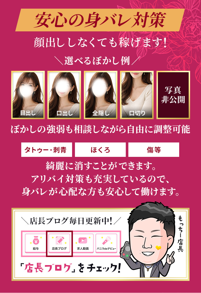 宣材写真は「顔出しナシ」の女性がほとんど。知り合いに見つかる可能性はほとんど無く安心です。徹底した身バレ対策を最優先に考えているので、プライバシーを守りながら自分らしく働ける環境が整っています。