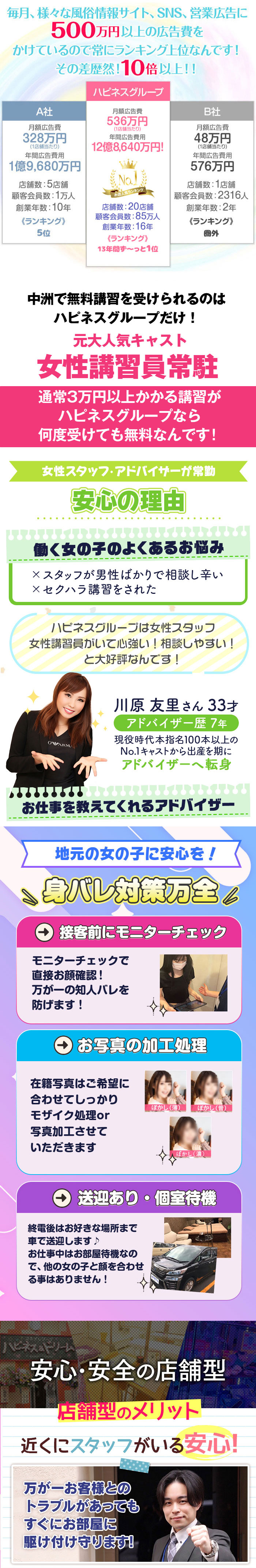 前のお店では月に50万いけばよかった方だけどハピネスグループで働いて100万円を稼げるようになりました!頑張った分だけお給料に反映されてモチベーションも上がります♪