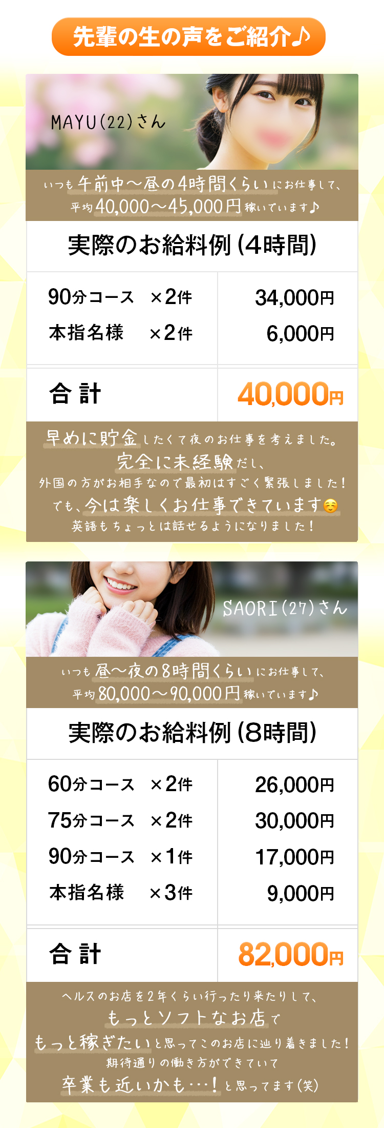 日給60,000円以上 60分 13,000円75分 15,000円 90分 17,000円 延長15分 4,000円 本指名 3,000円 90分コースのご利用が平均60%! 【入店してすぐの女性収入例】 ・1日フルタイムでお仕事 14時~26時(12時間勤務) 平均日給10万円 ・日中にOLさんと同じ時間帯でお仕事 10時~18時(8時間勤務) 平均日給6万円 ・お仕事終わりに終電までお仕事 17時~23時(6時間勤務) 平均日給5万円 |