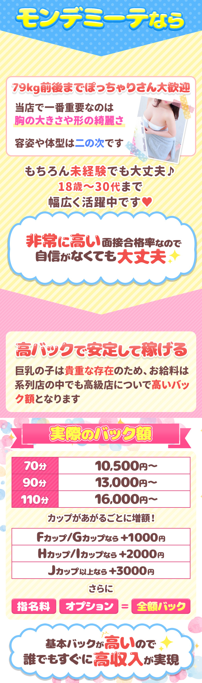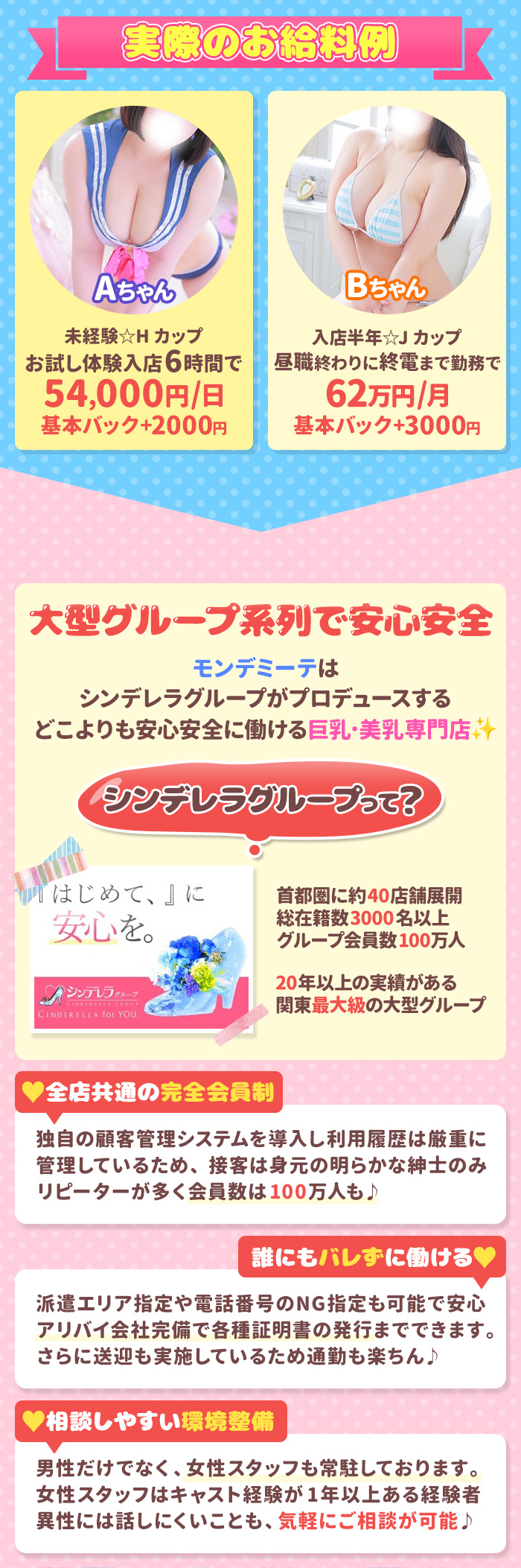 関東だけに約40店舗もの風俗店を経営するシンデレラグループの美乳・巨乳専門店『モンデミーテ』です。池袋店は中でも人気のお店で、グループ全体の売上No1になることも多いんですよ(^^♪♪お仕事1回あたりのお給料が専門店ならではの高額バックとなっていますので、効率よく稼げます。Dcup以上ある方は思い切って当店へご応募ください!