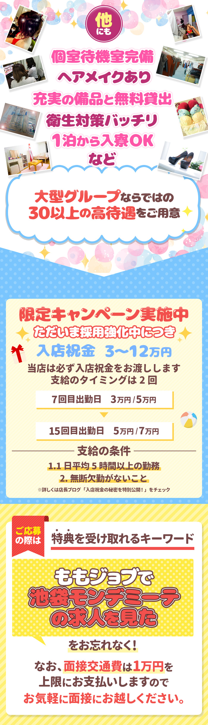 「ももジョブ」で『池袋モンデミーテ』の求人を見たとお伝えいただけるとスムーズです。