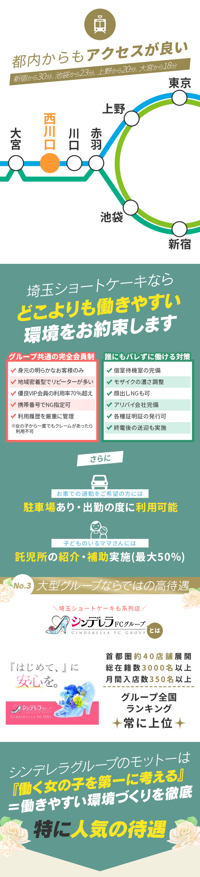 西川口を中心に大宮、浦和、美女木JC、越谷などのラブホテルへの出張をメインにしたデリバリーヘルス店です。休憩中は快適な個室待機室ですごせて、お仕事は綺麗なホテルのみ。デリバリーヘルス特有の不満は一切ありませんので安心して働けますよ。首都圏に約40店舗もの風俗店を展開する大型グループならではの集客力があるので決して暇はさせません。稼ぎの面もご期待ください!(^^♪