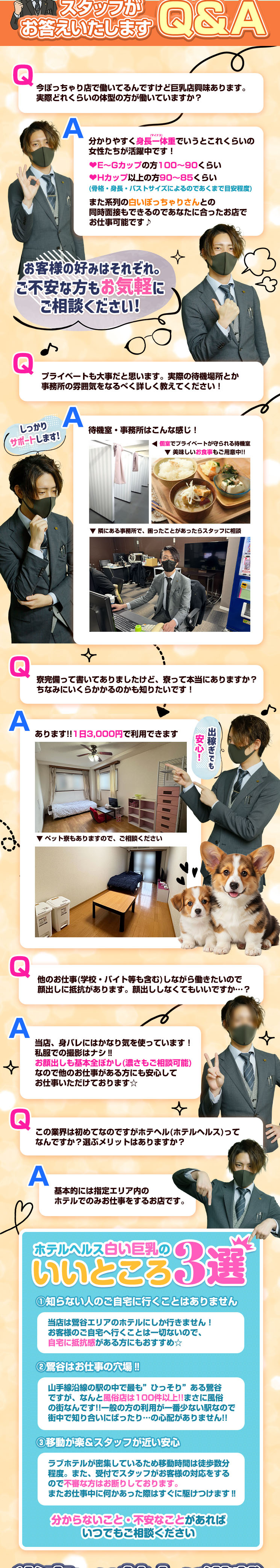 『白い巨乳』では、胸がメインのソフトサービスを行っております。 難しいテクニックなどは不要なので、安心してお問い合わせください♪