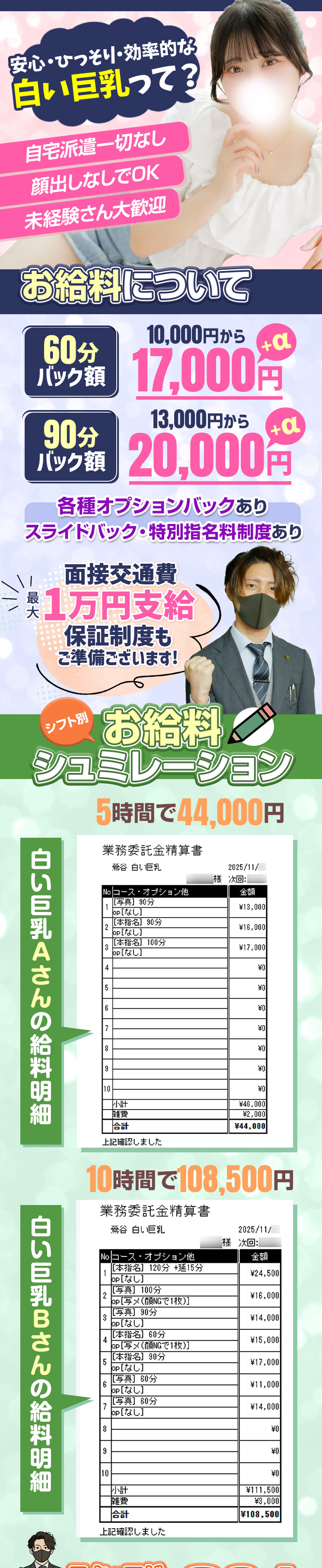 巨乳は武器です! その武器を最大限に活かしてもらうため、白い巨乳では10万円の体験入店パックをご用意しております♪