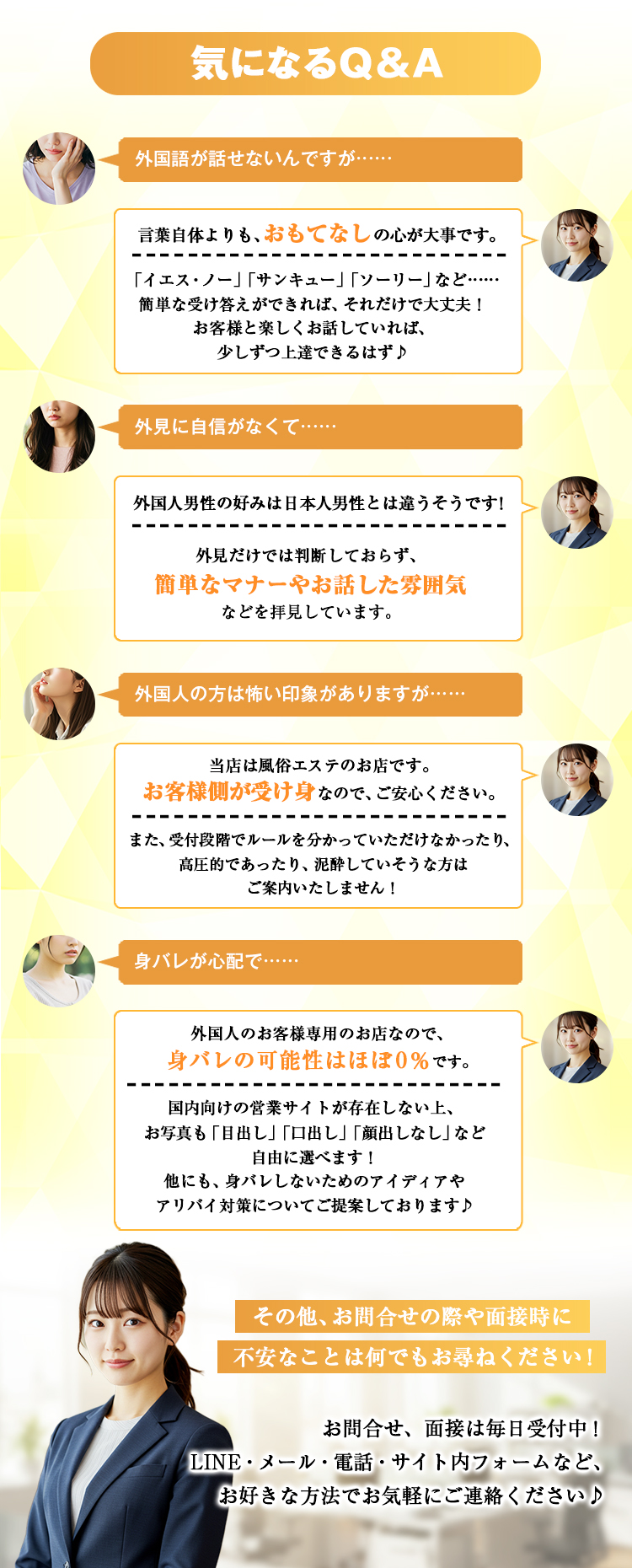 風俗のお仕事の経験、外国語が話せるかどうかなども問わず、皆さま大歓迎です!