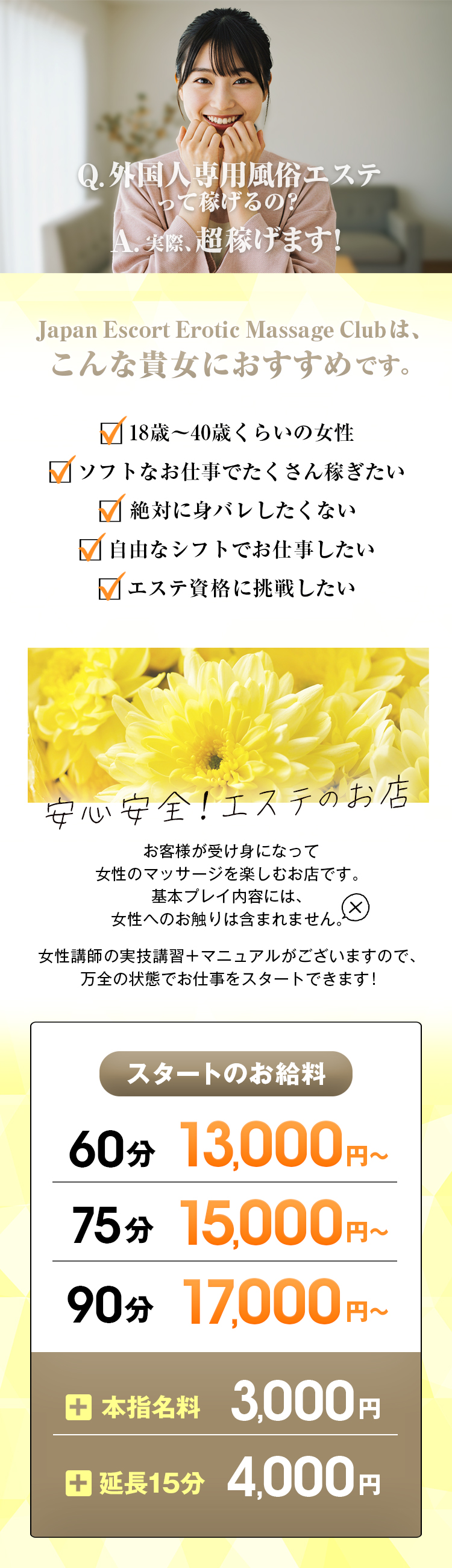 【Japan Escort Erotic Massage Club4つの待遇】 特典①90分最低17,000円スタート確約 特典②面接交通費2000円支給 特典③一般のエステ店でも通用する資格取得可能 特典④お友達紹介で50,000円プレゼント 在籍も出稼ぎも両方大歓迎です! 綺麗な寮完備! |