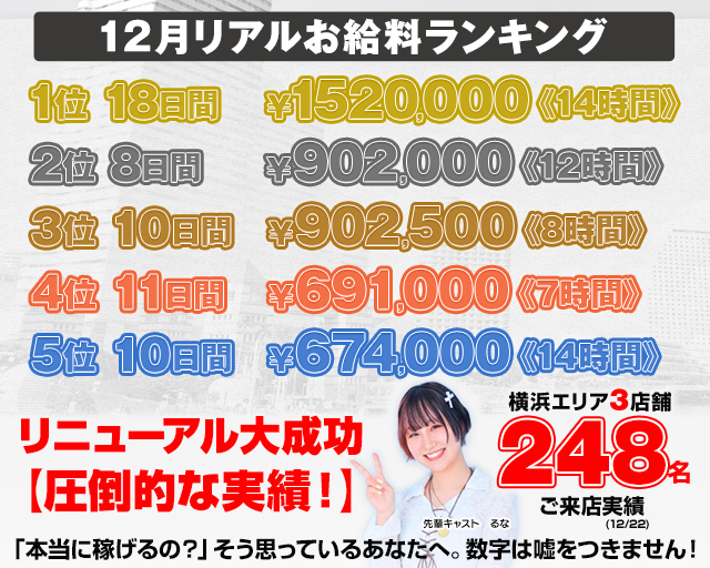 全国に10万人を超える【ドエロファン】がいるので、他のお店が暇な閑散期でも連日満員御礼!某風俗サイトのランキングでも不動の第1位を獲得しています。稼げないわけがありません!