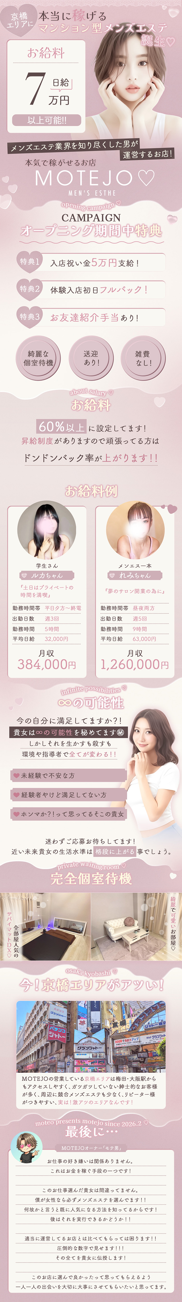 当店は完全非風俗です。プライベート空間で男性のお客様に全身のマッサージを行う健全なお仕事になります。 ルームの場所は京橋エリア、梅田・大阪駅からもアクセスしやすく、ガツガツしていない紳士的なお客様が多く、周辺に競合メンズエステも少なく、リピーター様がつきやすい、実は!激アツのエリアなんです✨ 《出勤してから退勤までお仕事の流れ》 軽いルーム清掃などをして、いつお客様が来ても大丈夫な様に準備をして待ってもらいます。全ての予約が終了したら片付けをして精算をしてスグに帰れます!! メンタルケアなども任せてください✨ 病んだ時は優しく話を聞きますので愚痴などガンガンこぼしてください笑 |