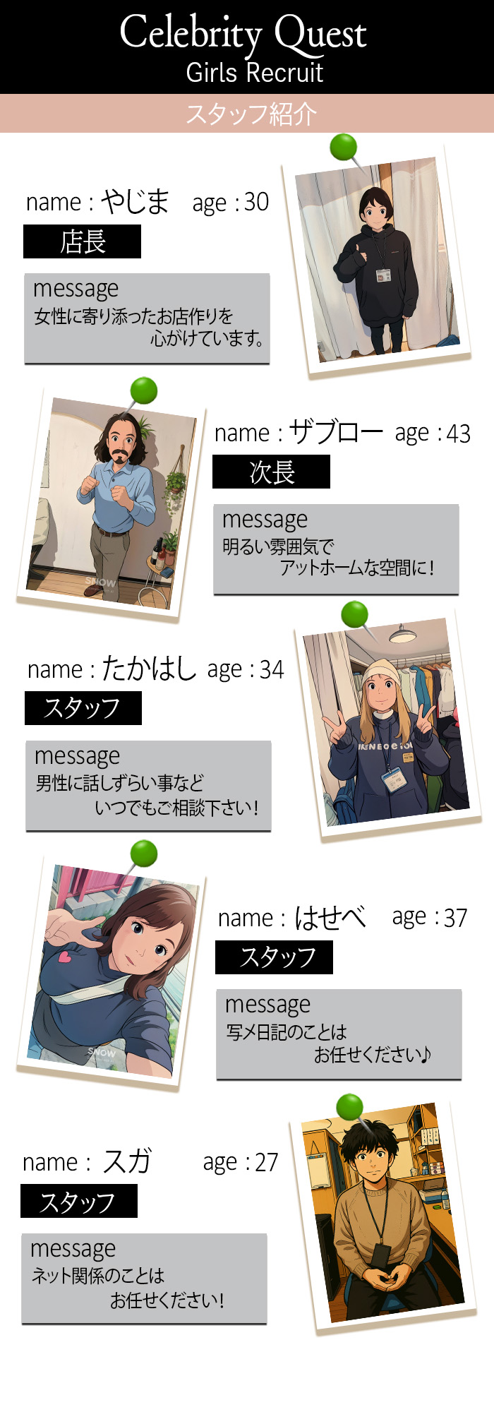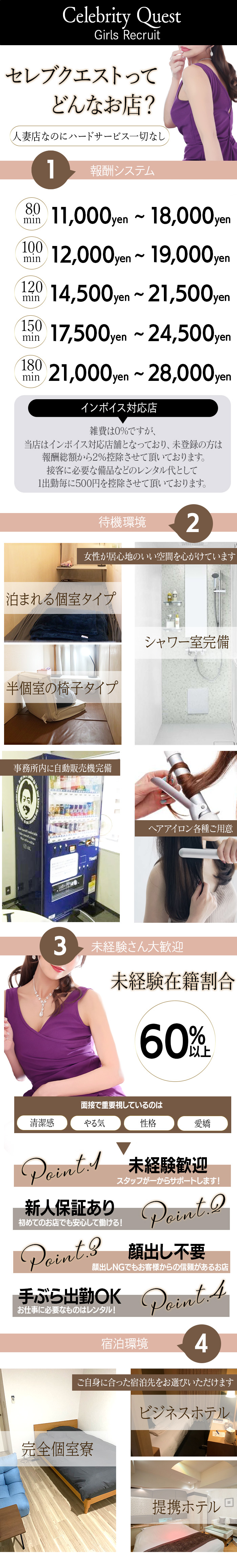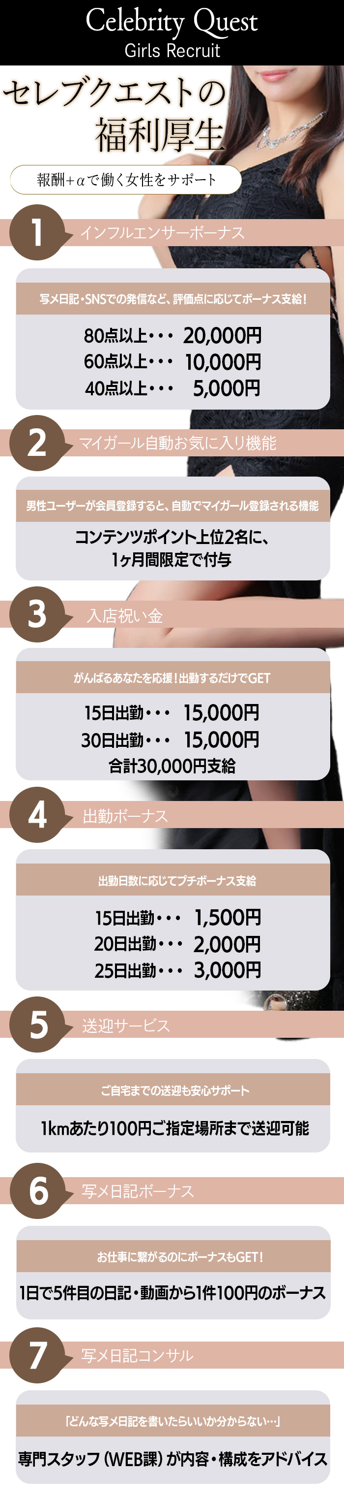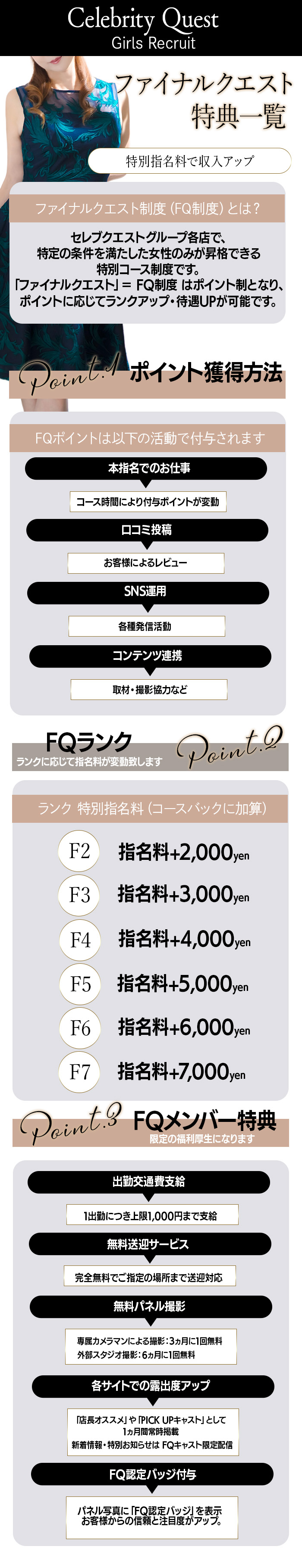 移籍者続出中!移籍ご希望の女性には、今いるお店よりも必ず条件をUPさせて頂きます。収入以外にも、環境もトップクラスのセレブクエストへぜひお越し下さい。秘密厳守致します。