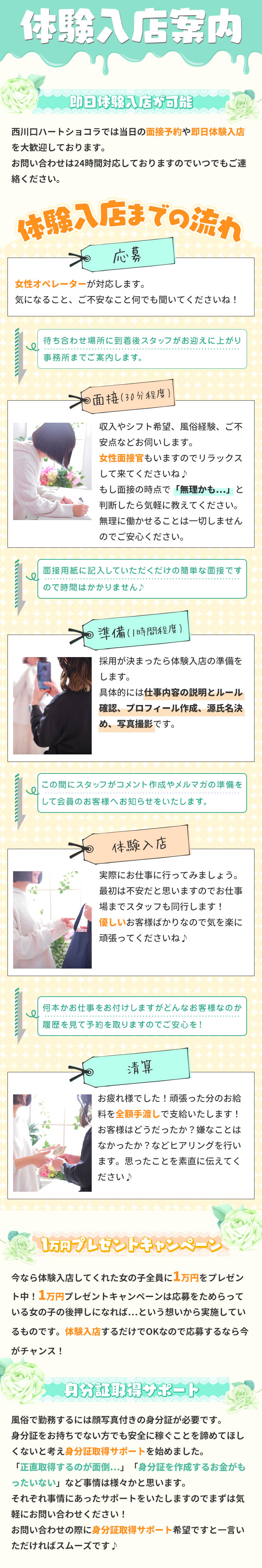 お仕事内容やお給料をより詳しくしっかりご説明のうえ、ご本人の意思確認をきちんととってから体験入店してもらいますのでご安心ください。
