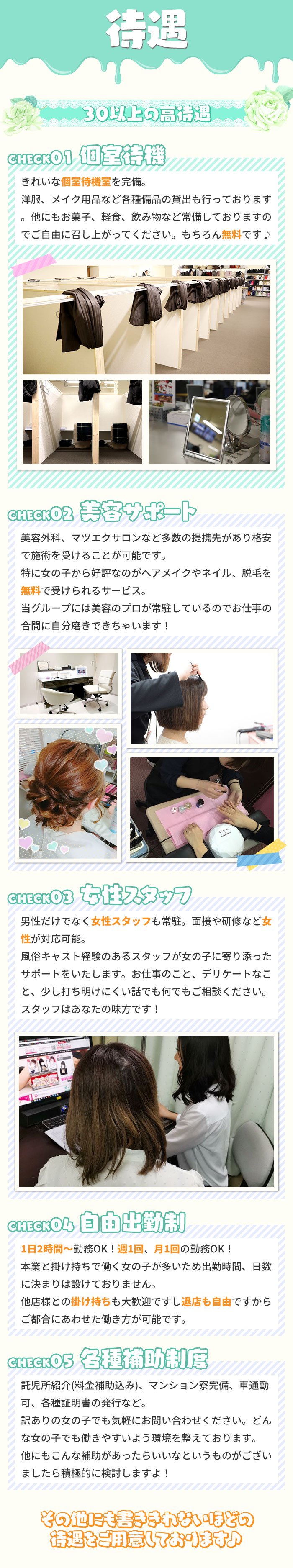 女性スタッフによる面接や、個室待機室、万全の身バレ対策など、未経験で不安な女の子にとって安心できる待遇が盛りだくさん!