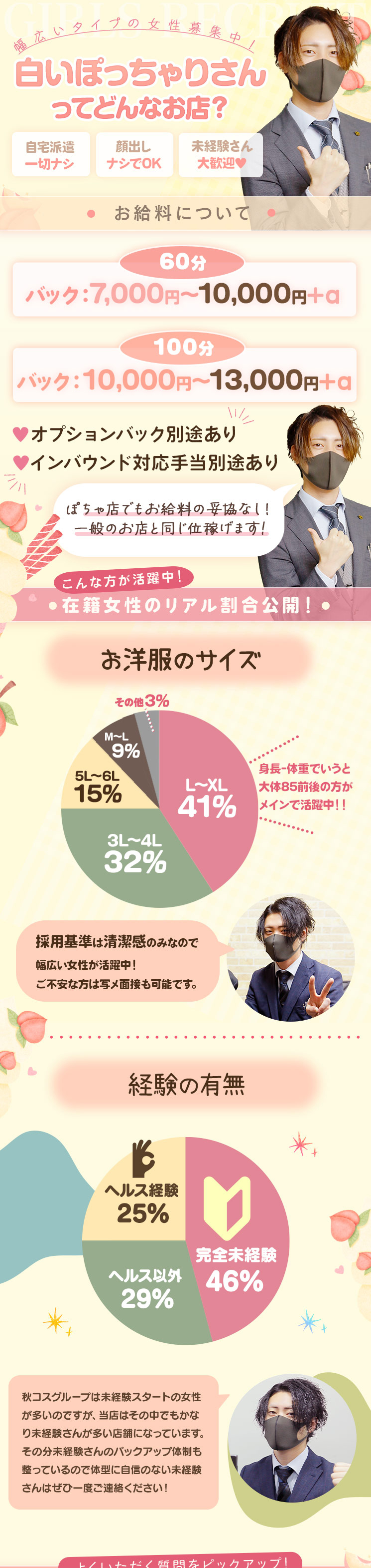 『白いぽっちゃりさん』では、風俗経験や難しいテクニックを必要としません。そのまま来て、そのまま働くことが出来ます。
