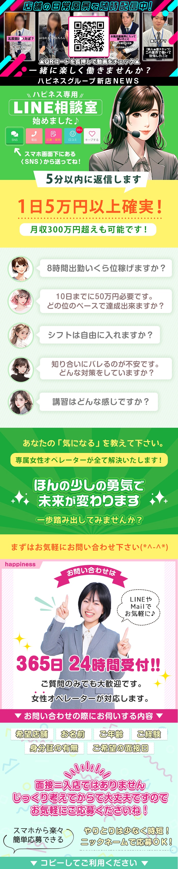 ハピネス東京は【絶対に満足して頂ける収入】と【充実の待遇】を全ての女の子にお約束致します。