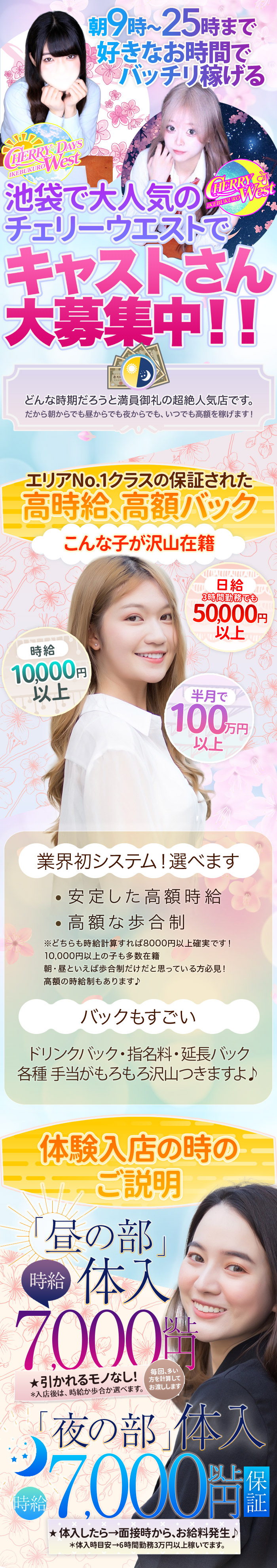 朝9時〜25時の好きな時間で稼げる池袋で大人気のチェリーウエストでキャストさん大募集中!!
