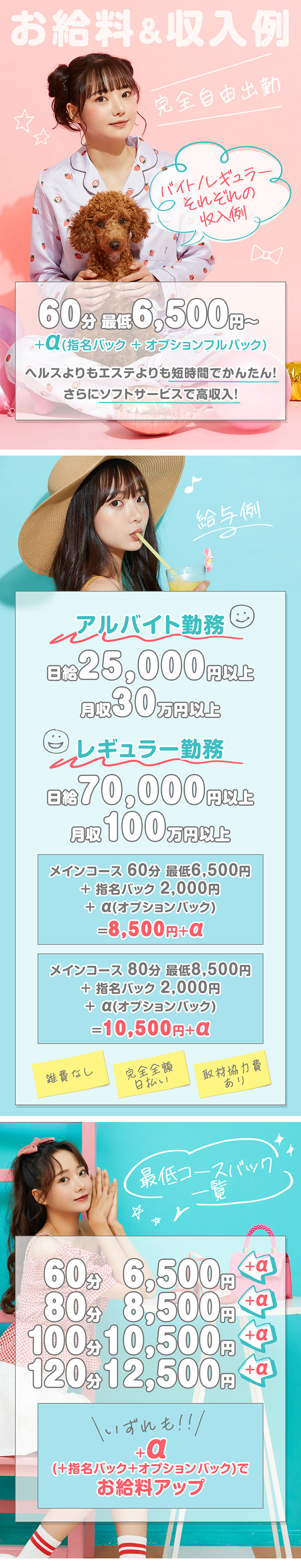 日給30,000円以上 『給料例』・某エステ店のお給料例→メインコース90分12,000円 (コースバック+指名料バック込み) ・某ヘルス店のお給料例→メインコース90分14,000円 (コースバック+指名料バック込み) ・【当店のお給料例】 →メインコース60分最低6,500円+指名バック2,000円+α(オプションバック)=8,500円+α →メインコース80分最低8,500円+指名バック2,000円+α(オプションバック)=10,500円+α さらに、 ※雑費なし、取材協 |