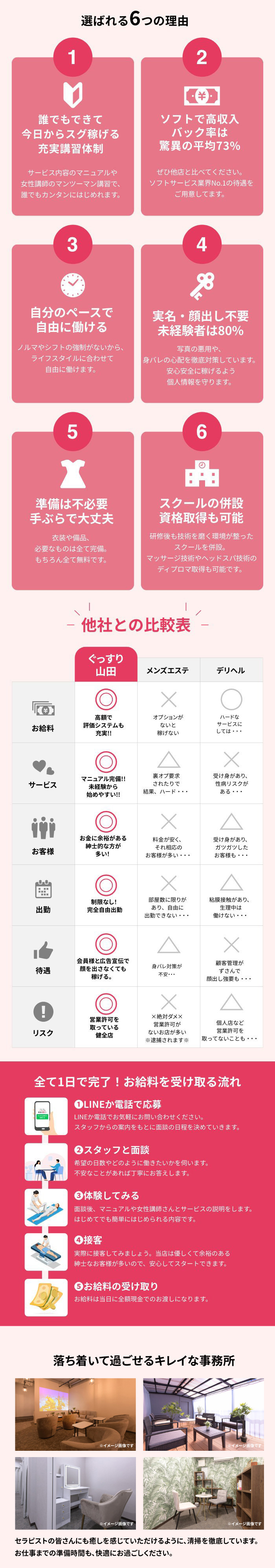 ぐっすり山田は、 たくさんの特典をご用意しています! ⋆⸜特典①⸝⋆ 全員対象!面接交通費支給いたします※上限2,000円 ⋆⸜特典②⸝⋆ ご友人紹介で50,000円プレゼント! ⋆⸜特典③⸝⋆ 一般のエステ店でも通用する資格取得可能 【その他の待遇】 ■タトゥーOK ■全額日払い ■昇給システムあり ■ノルマ・罰金なし ■終電後送りあり ■掛け持ちOK ■写メ面接可能 ■希望者には寮完備 ■アリバイ会社完備 ■完全分煙 ■Wi-Fi完備 ■個室待機 |