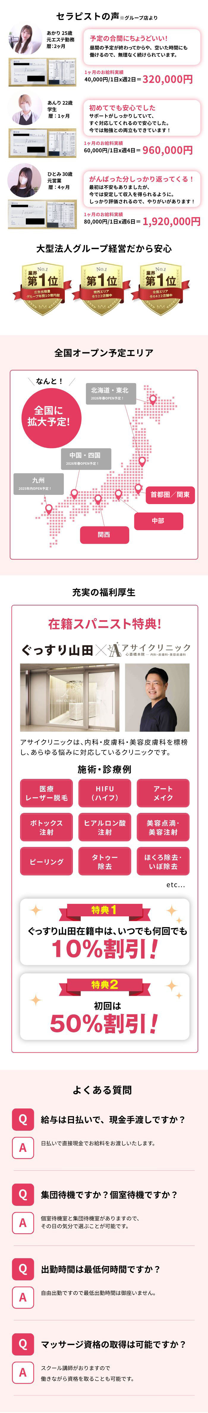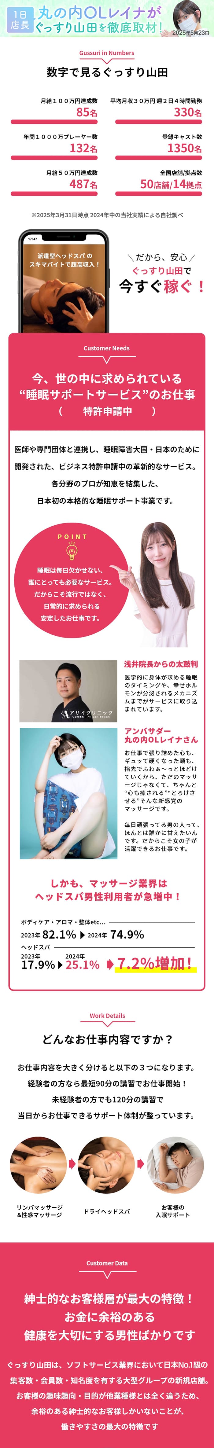 ぐっすり山田は、 たくさんの特典をご用意しています! ⋆⸜特典①⸝⋆ 全員対象!面接交通費支給いたします※上限2,000円 ⋆⸜特典②⸝⋆ ご友人紹介で50,000円プレゼント! ⋆⸜特典③⸝⋆ 一般のエステ店でも通用する資格取得可能 【その他の待遇】 ■タトゥーOK ■全額日払い ■昇給システムあり ■ノルマ・罰金なし ■終電後送りあり ■掛け持ちOK ■写メ面接可能 ■希望者には寮完備 ■アリバイ会社完備 ■完全分煙 ■Wi-Fi完備 ■個室待機 |