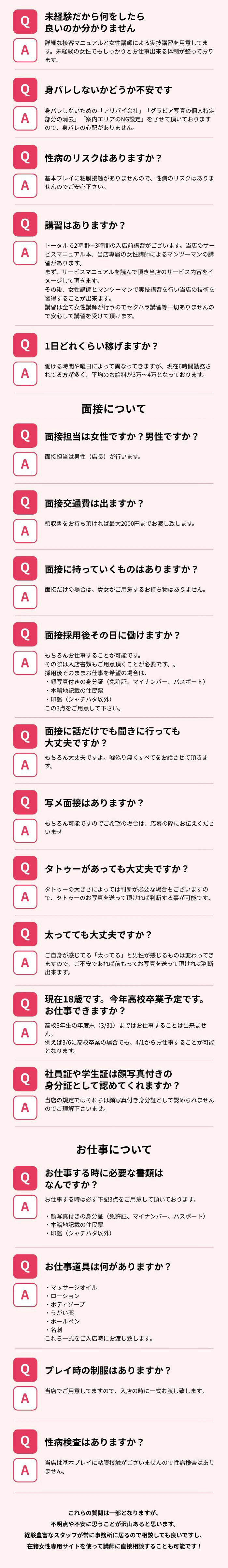| 応募資格 | ★未経験者大歓迎! ★男性を「癒すこと」が大好きな方 ★18歳以上~35歳くらい(高校生不可) |