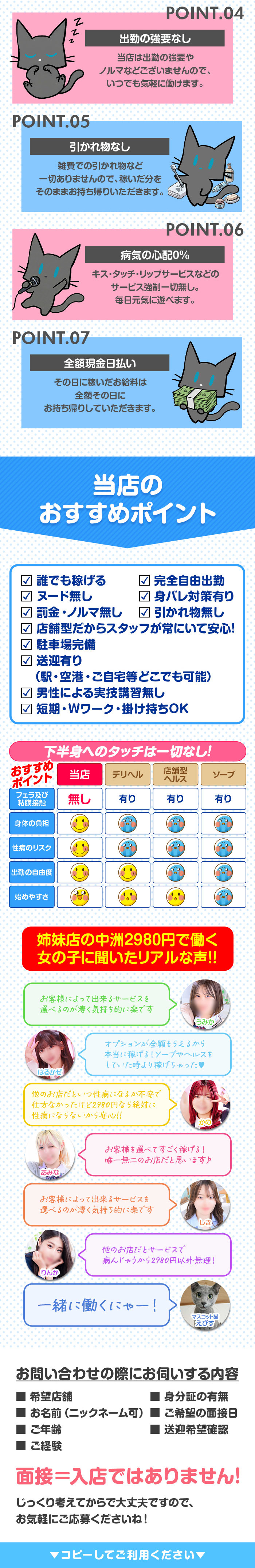 服は着たままで手を使ったソフトサービスが基本です。 口頭による講習のみで、誰でも簡単にお仕事がスタートできます♪ もちろん生理中でもお仕事ができるので、頑張り次第では安定した収入が期待できるのも当店の魅力です! 多かった質問のQ&A^^ Q・ハンドサービスってなんですか? A・男性器の部分を手でしごく、いわいる手コキのサービスです。 Q・性病の心配はありますか? A・性病の心配は不要です!当店のサービスでは一切性病の心配は不要です。 Q・彼バレ・親バレが怖いです。対策はありますか? A・はい!当店独自のバレない為の7つのノウハウがございます! Q・接客前お客様の顔確認はできますか? A・はい!マジック・ミラーで【直接】お客様の顔を確認出来ます! Q・やりたくないオプションはNGでも大丈夫ですか? A・はい!もちろんです^^やりたくない事はやらなくてOK Q・遠方ですが、送迎はりますか? A・交通機が終了している場合、ご自宅まで送迎致します! Q・お給料はその日にもらえますか? A・もちろんです!全額日払いです! Q・男性経験があまりありません。大丈夫ですか? A・大丈夫ですよ!お仕事も簡単ですし、簡単な口頭での説明もさせて頂きます。 Q・オプションがNGだらけですが、稼げますか? A・はい^^全オプションNGの方でも2万は稼げます^^ Q・体験入店だけでも大丈夫ですか? A・はい!1日のみの勤務でも大丈夫です! Q・ネットに顔をだしたくないですが大丈夫ですか? A・はい^^大丈夫です! LINE ID:hapi.josi お気軽にお問い合わせくださいませ\(^o^)/ |