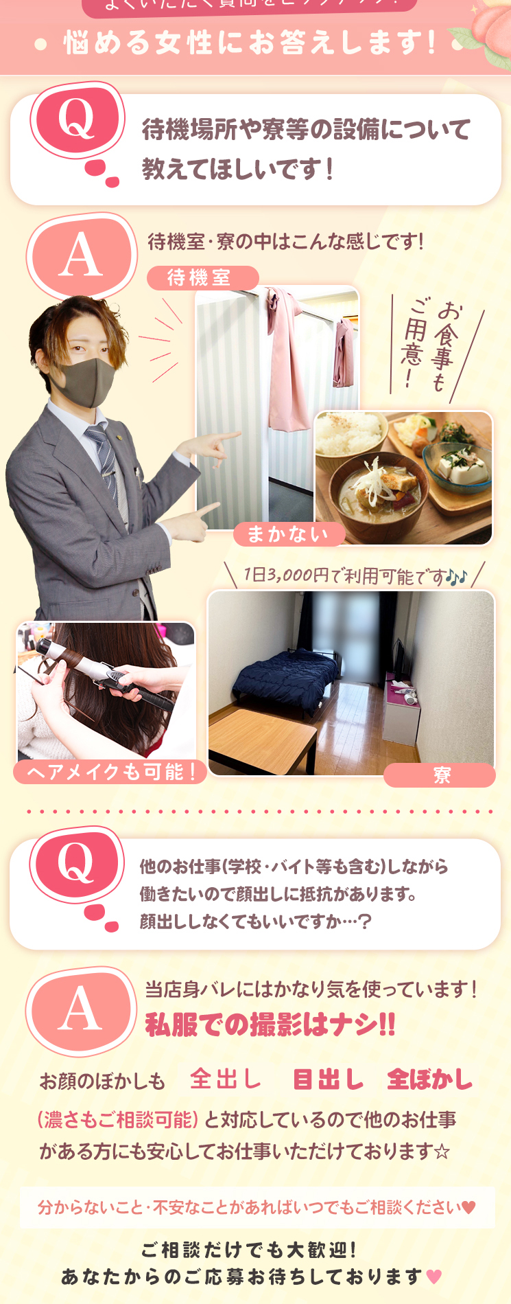 高級寮完備、最先端アリバイ対策、無料ヘアメイク常駐、未経験者歓迎、日払いOK、送迎あり、交通費支給、託児所あり、報奨金あり、制服貸与、自由出勤制、1日体験入店あり、個室待機、ノルマ・罰金なし、定期健康診断あり、マスコミ手当あり、性格重視、社員はスーツetc...