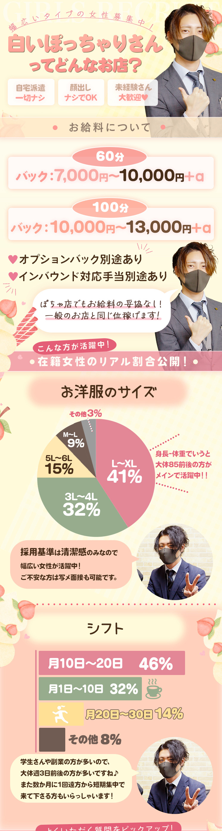 『白いぽっちゃりさん』では、風俗経験や難しいテクニックを必要としません。そのまま来て、そのまま働くことが出来ます。