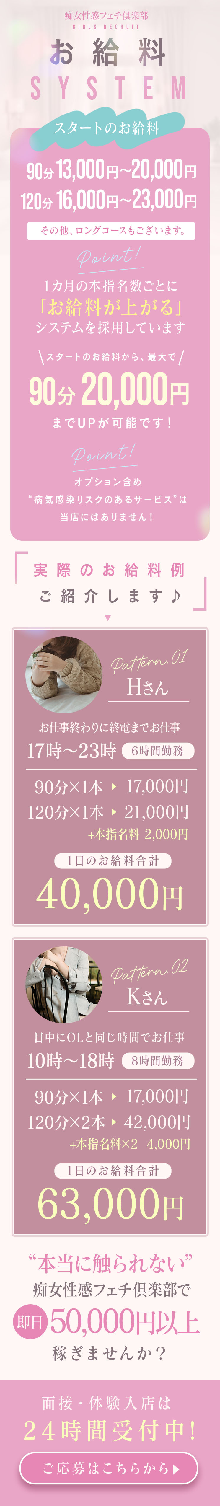 日給35,000円以上 M性感は脱がない・舐めない・触られない!未経験の方でも【即日35000円以上】稼げます♪ ✩お給料 60分 9,000円~15,000円 75分 11,000円~17,000円 90分 13,000円~19,000円 120分 16,000円~22,000円 (+本指名料 2,000円) その他オプションバックあり ⳹90分コースのご利用が平均50%⳼ ※頑張った分だけお給料が上がるシステム! オプション&指名料はフルバックで60分最大15,000円 |