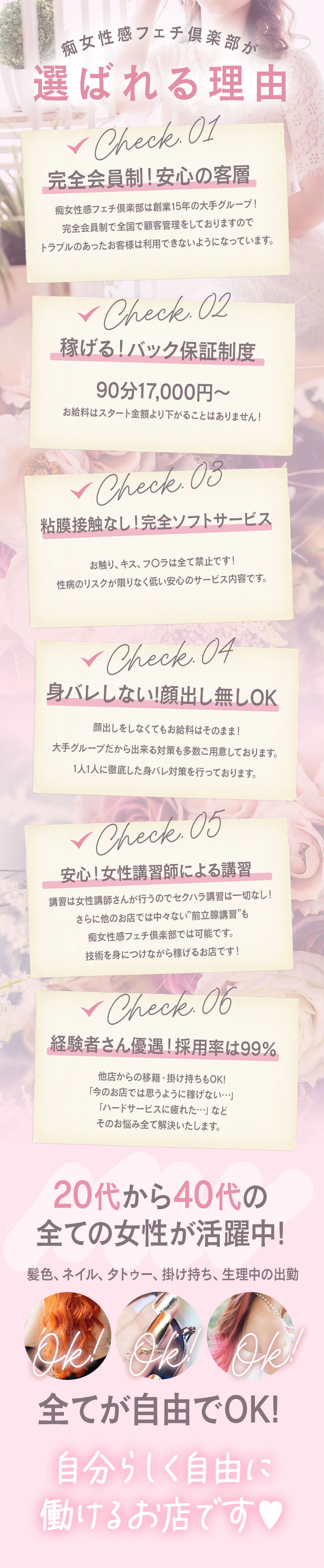 痴女性感フェチ俱楽部は、大人の【脱がない×舐めない×触られない】お店です♪ 圧倒的な『採用率』の高さは魅力の一つ!お客様からのニーズが幅広く、女性の年齢や容姿のみで採用を判断…
