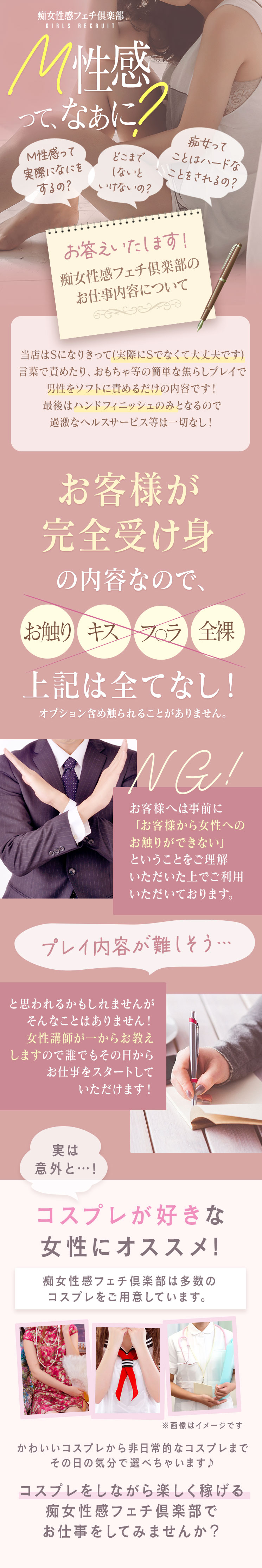 『M性感って知ってる?』 痴女性感フェチ俱楽部は即日で35,000円以上稼げる♪ M性感は簡単な焦らしプレイや言葉責めをしていただき、男性をソフトに責めるだけ♪ 女性が受身になるサービスがなく、お触りは一切ないお店です! 簡単な焦らしプレイや言葉責めで最後に手コキでフィニッシュしていただく内容となっております♪ 未経験の方でもソフトな内容、お仕事内容が詳しく書いているマニュアルや 女性講師による講習が完備しておりますので安心して働いていただけます! |