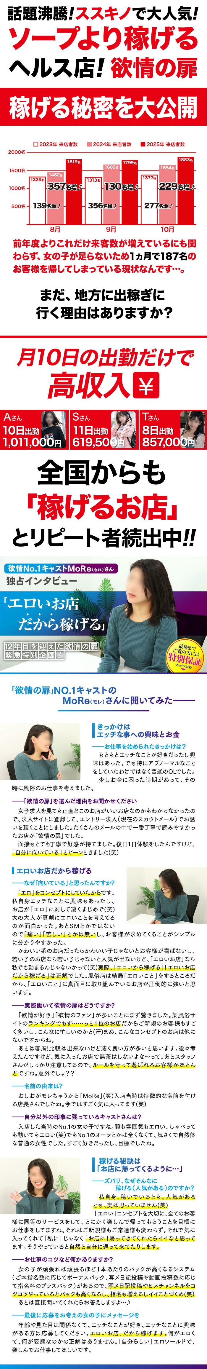 10万人を超える【ドエロファン】がいるので、他のお店が暇な閑散期でも連日満員御礼!某風俗サイトのランキングでも不動の第1位を獲得しています。稼げないわけがありません!