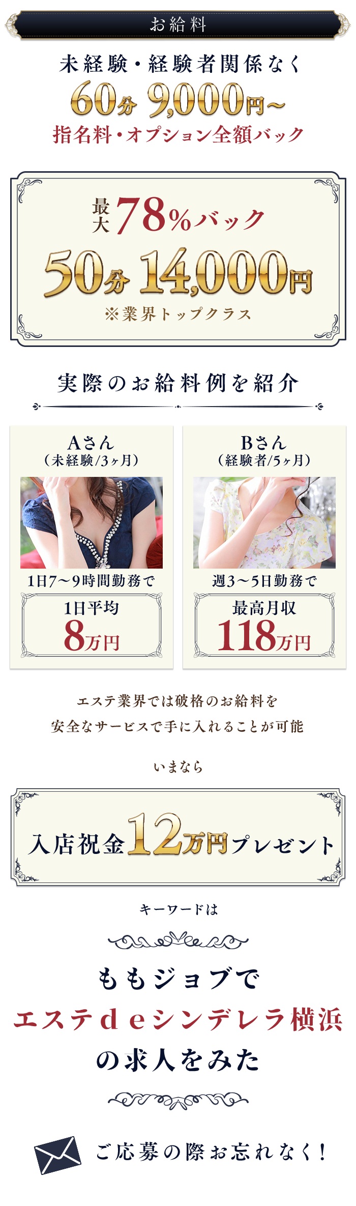 当店、エステdeシンデレラ横浜では「キスなし・フェラなし・受身なし」のソフトサービスで働けて、60分9,000円~の高バック♪高待遇をお約束します!