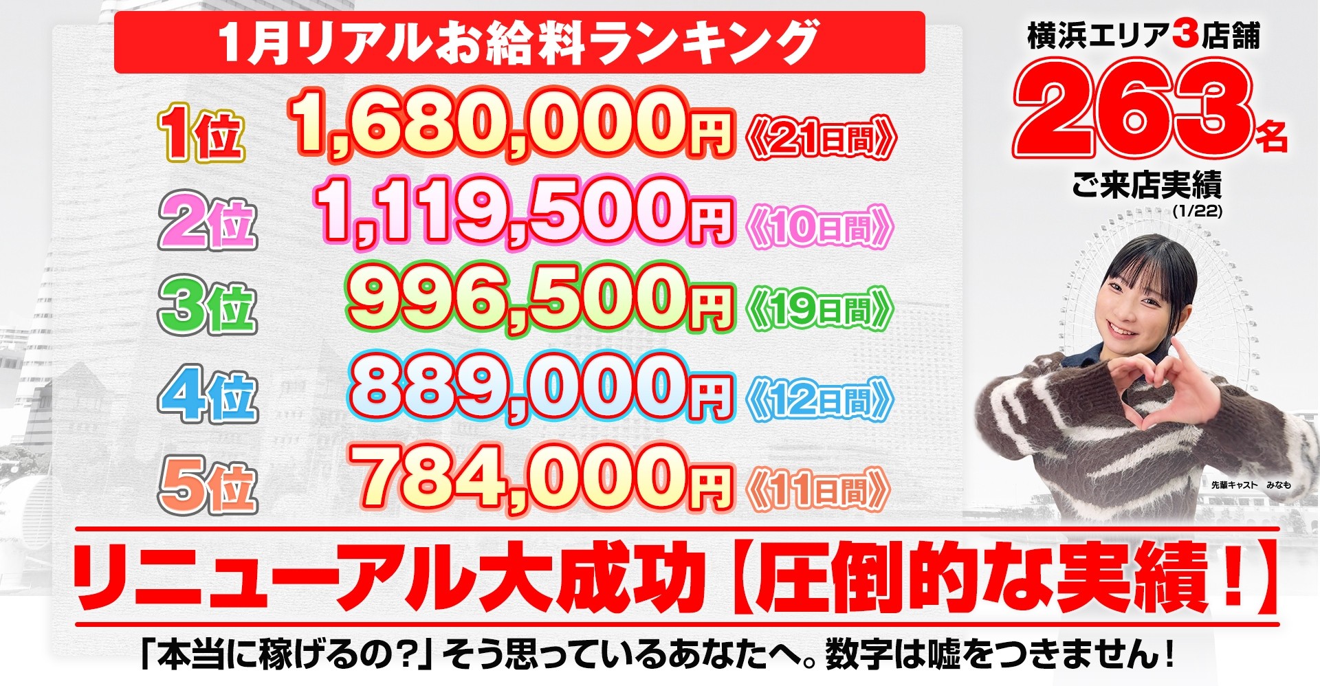 全国でもトップクラスの知名度と、圧倒的な集客力がありますので、本業、学業があって短時間の勤務でも効率的に高収入をGET♪同業他店舗、飲み屋さんとの掛け持ちもOK✨
