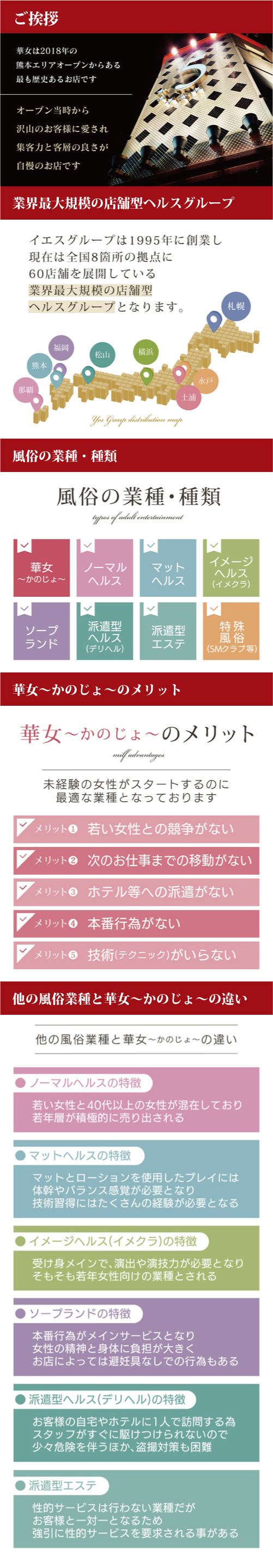 『華女~かのじょ~』は、札幌、水戸、土浦、横浜、松山、福岡、熊本、那覇に総数60の店舗型ヘルスを展開する『イエスグループ』が運営する『大人の女性の為の店舗型ヘルス』となっております。