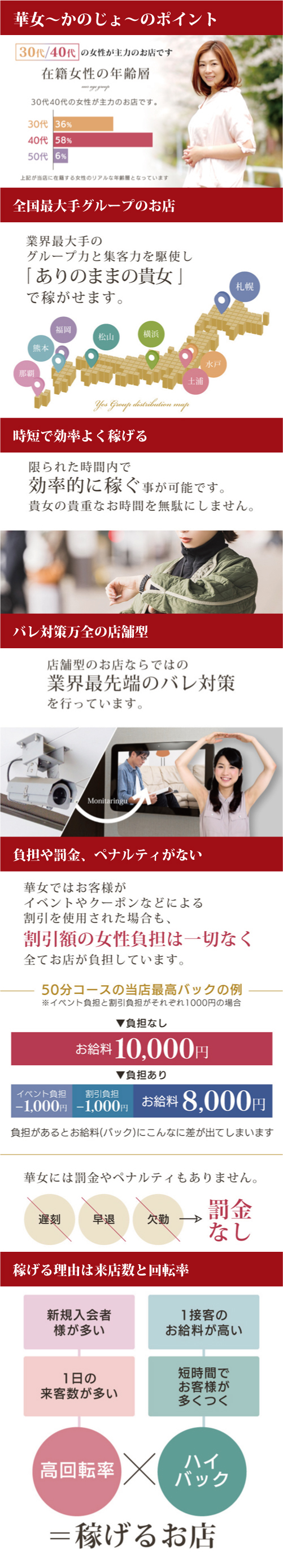 大人の女性が『年齢』や『体形』を気にされる事なく『店舗型』という働く女性にとって安心で安全な『勤務環境』と『風俗業界最大手のグループ力』と『ノウハウ』『集客力』を駆使し、ありのままの貴女で稼ぐ事が出来ます。