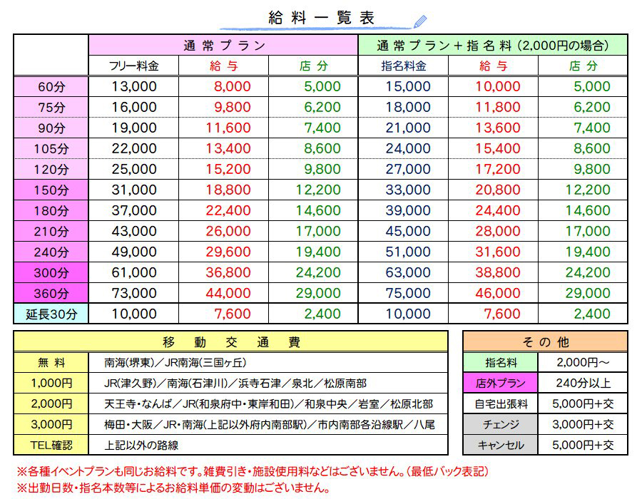 日給50,000円以上 ○コース毎のお給料システム60分コース(料金 13,000円)| 8,000円~ 75分コース(料金 16,000円)| 9,800円~ 90分コース(料金 19,000円)|11,600円~ 120分コース(料金 25,000円)|15,200円~ ○延長料金:30分延長毎(料金 10,000円)|7,600円 ○指名料:2,000円~/コース ○移動交通費:1,000円~/コース(堺東・三国ヶ丘以外) ※指名料・オプション・移動交通費などは全額バックです |