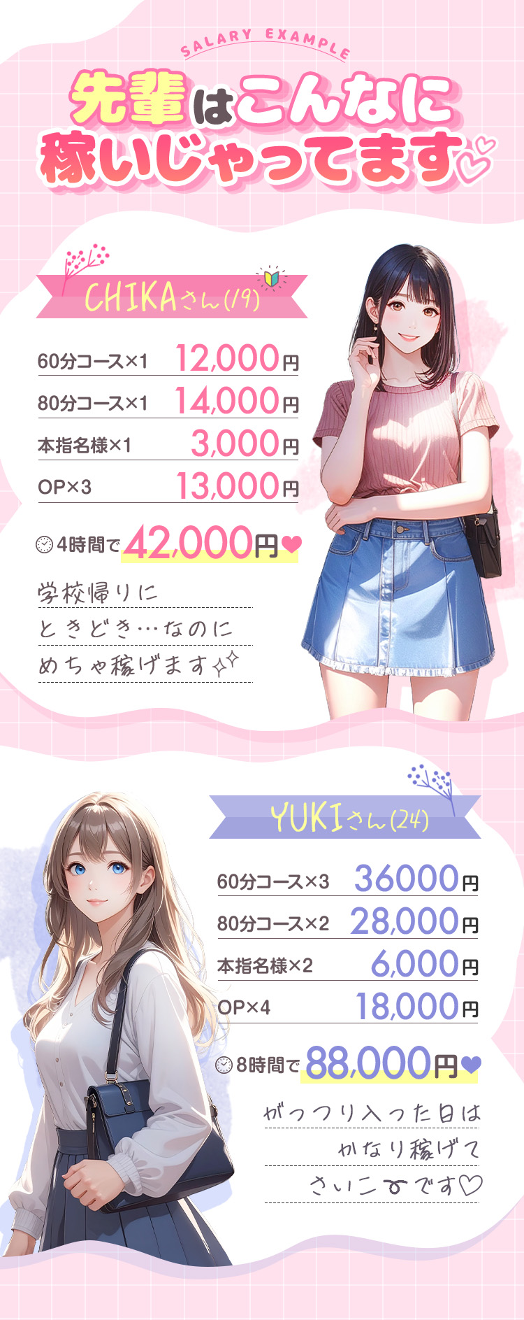 日給60,000円以上 60分 12,000円80分 14,000円 延長20分 4,000円 ネット指名 1,000円 本指名 3,000円 60分、80分コースのご利用が平均80%! 【入店してすぐの女性収入例】 ・日中のスキマ時間でお仕事 10時~14時(4時間勤務) 平均日給4.2万円~ ・お仕事終わりに終電までお仕事 17時~翌1時(8時間勤務) 平均日給8.5万円~ |