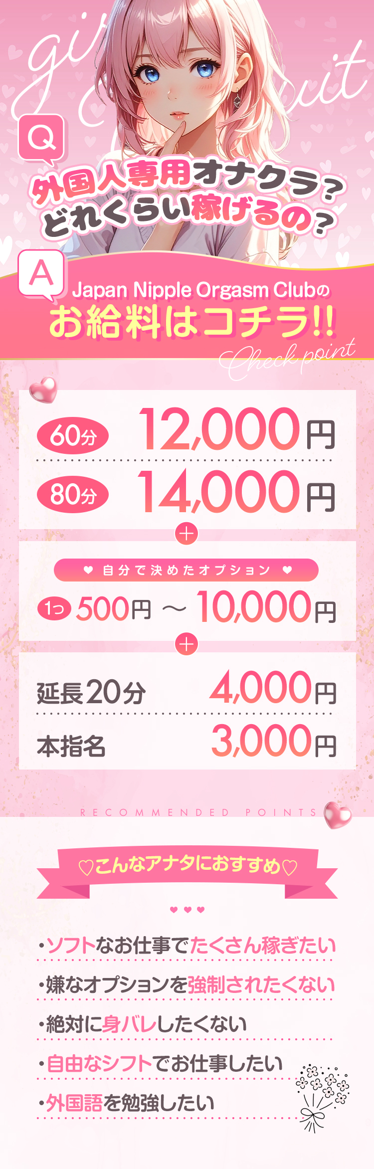 【Japan Nipple Orgasm Club4つの待遇】 特典①80分最低14,000円スタート確約 特典②自由に決められるオプション 特典③面接交通費2000円支給 特典④お友達紹介で50,000円プレゼント 在籍も出稼ぎも両方大歓迎です! 綺麗な寮完備! |