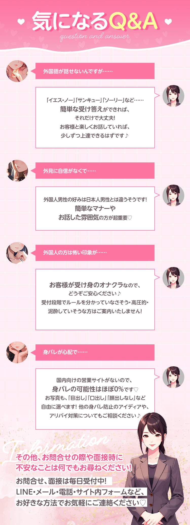 風俗のお仕事の経験、外国語が話せるかどうかなども問わず、皆さま大歓迎です!