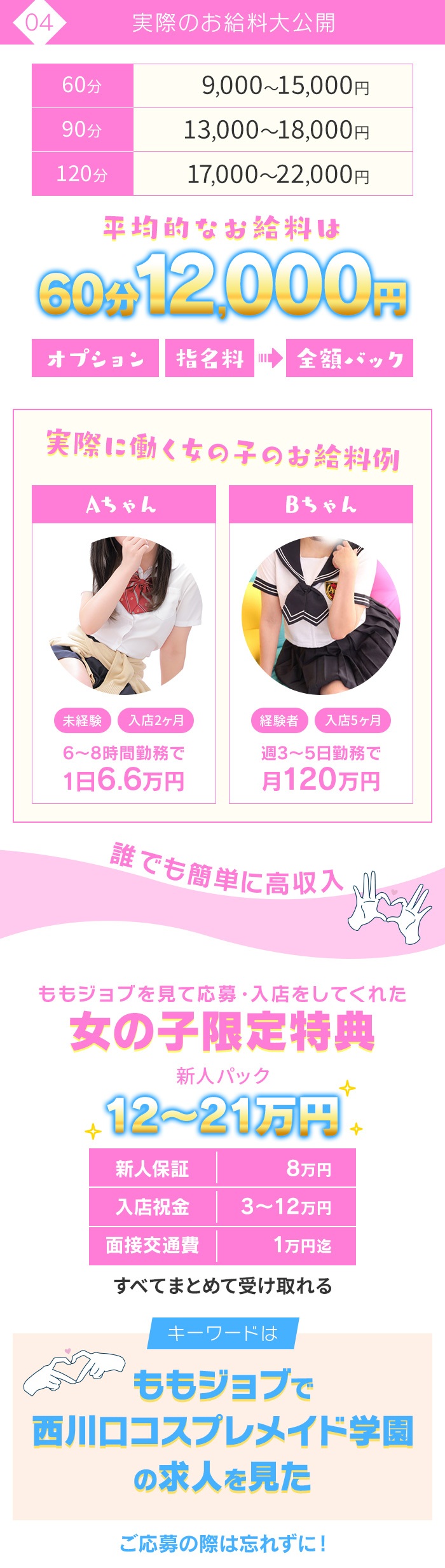 「ももジョブ」で『西川口コスプレメイド学園』の求人を見たとお伝えいただけるとスムーズです。