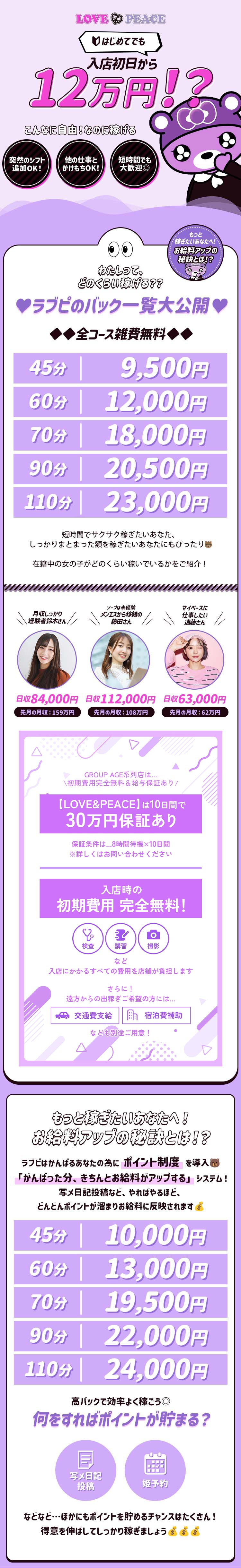 日給80,000円以上 【基本バック】◆◆全コース雑費無料◆◆ 45分 9,500円 60分 12,000円 70分 18,000円 90分 20,500円 110分 23,000円 ラブピに最近入店した新人さんの 平均日収は62,000円! 初日から124,000円稼いだ新人さんも! 未経験のあなたも最初からしっかり稼げるラブピです ʕง•ᴥ•ʔง ♥═━┈┈ ♡═━┈┈ 8時間待機ʕ•ᴥ•ʔ10日間で 【 3 0 万 円 】 あんしん給与保証あ |