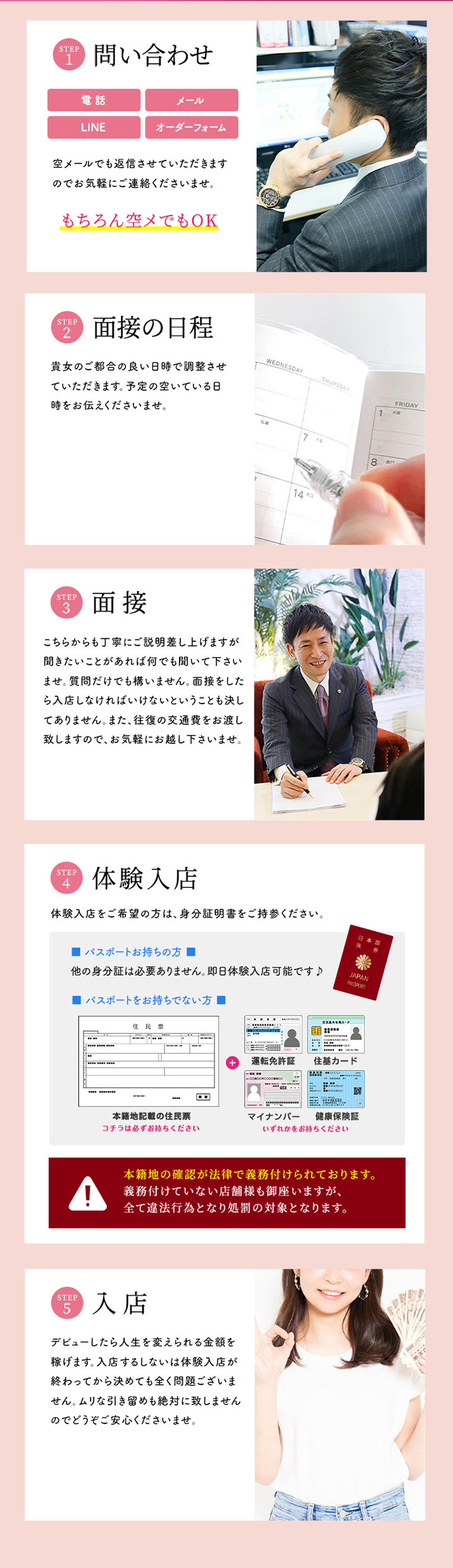 | 応募資格 | 18歳以上(高校生不可)~40代女性まで活躍中! 業界未経験者・経験者の方・学生さん・OLさん・フリーターさん、主婦の方、シングルマザーさんも大歓迎です。働きかたなど、ご相談ください^^ ※18歳未満(高校生を含む)のご応募はお断りします。 |