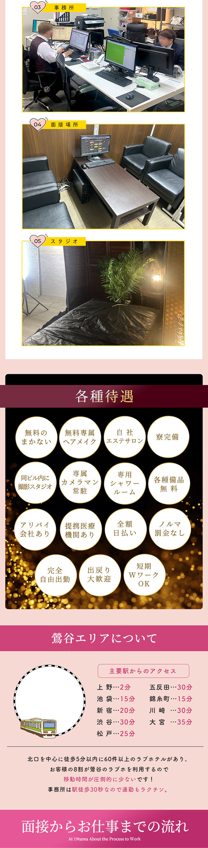 出勤数・本指名数などでノルマを課すようなことは一切ありません。女の子が快適に、気持ちよく働いて頂ける環境を、私たちは目指しています♪