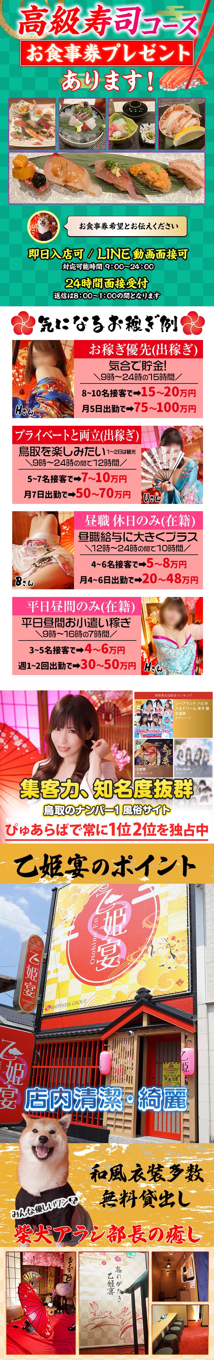 当店『乙姫宴(おとひめえん)』は米子初の純和風ソープランドです。 体型が隠れて誰でも似合う素敵な和風衣装がポイント! コンセプト的に、20歳以上~30代の女性が活躍中です♪ お仕事内容は女性講習員が丁寧にお教えいたしますので、完全未経験や他店でいまいちテクニックを教えてもらえなかった…という女性でも安心してご応募ください。 |